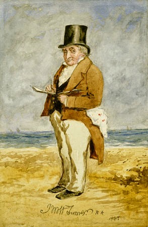 Flint Castle, 1838. Acuarela en papel La primera vez que ví la pintura de Turner, fue allá en los años 80, en una exposición de "Caixa Forum", en el Pº de San Juan, en Barcelona. Tengo todavía el recuerdo vívido de permanecer frente a un cuadro de grandes dimensiones en el que aparecía un barco envuelto en brumas, en unas nubes que casi cubrían el cuadro, y "preguntándome, cómo hacía ese pintor para poder pintar esas nubes, esas brumas..., esa luz...." Estoy conociendo la Arterapia de la línea antroposófica de (Rudolf Steiner), en la que se trabaja según la teoría de los colores de "Goethe", y que Turner conoció y experimentó en sus cuadros. Y ha sido recientemente, que tras una sesión, en la que pintamos con aquarelas, que quizás (?) llegué a entender un poco, cómo Turner podía conseguir plasmar esas nubes, esas nieblas, esa luz... Pero bastó para decidirme a hablar un poco de su obra y expresar lo que siento de ella. Joseph Mallord William Turner, nació en Londres el 23 de abril (Tauro): signo astrológico; de 1775, y murió en Chelsea, Londres el 19 de diciembre de 1851. Su família vivía en el corazón de Covent Garden, cerca del Támesis, lugar al que dedicó muchos cuadros. Su padre era barbero y le ayudó mucho en su instrucción. Su madre, tuvo problemas de inestabilidad mental. Turner nunca habló mucho de su infancia. Se sabe que su madre murió en un hospital psiquiátrico. Empezó de joven a mostrar su habilidad en el dibujo; los dibujos más bellos los exponía en la tienda de su padre. A los 14 años, en 1789 ingresa en la escuela de la Royal Academy. Los dibujos y las acuarelas ya eran notables. Entre 1793 y 1795 realizó numerosos viajes a Gales y a otras regiones de Inglaterra, especializándose como dibujante topográfico.